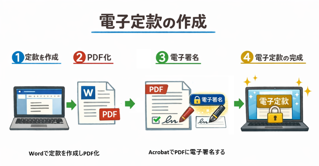 電子定款とは、Word等のワープロソフトで作成した定款をPDF化し、さらに電子署名を付与したものを指します。単にWord等で作成しただけの定款は電子定款には該当しません。