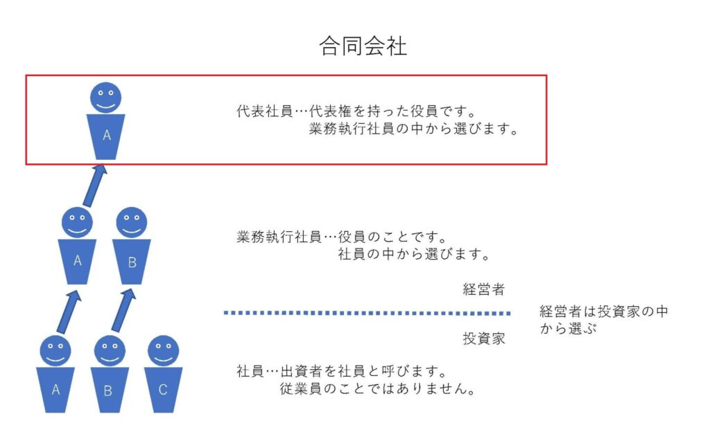 合同会社における「社員」とは、出資者のことを指します。 株式会社でいう「株主」に相当するものであり、一般的にいう従業員(正社員・パート・派遣社員など)とは全く別の概念です。