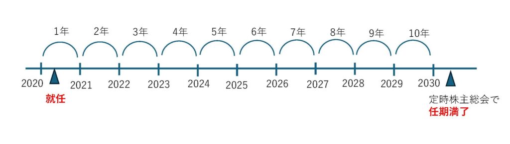 例えば、設立日が2020年4月で決算日を3月末とした場合、1期目の事業年度は2020年4月から2021年3月末までとなります。 取締役の就任日は設立日(2020年4月)ですので、2021年3月に終了する事業年度は「就任後1年以内に終了する事業年度」に該当します。「10年以内に終了する事業年度」のうち最終のものは、2030年3月末に終了する事業年度となります。 この事業年度に係る定時株主総会を開催するまでが、取締役の任期となります。 そして、その定時株主総会で次の10年の役員を選任します。